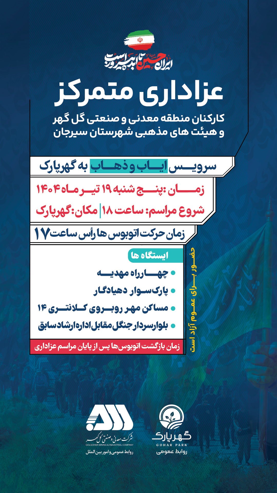 🔸سرویس ایاب و ذهاب به گهرپارک زمان حرکت اتوبوس‌ها رأس ساعت ۱۷ 🔸ایستگاه‌ها •چهارراه مهدیه •پارک‌سوار دهیادگار •مساکن مهر روبروی کلانتری ۱۴ •بلوار سردار جنگل مقابل اداره‌ارشادسابق زمان بازگشت اتوبوس‌ها پس از پایان مراسم عزاداری