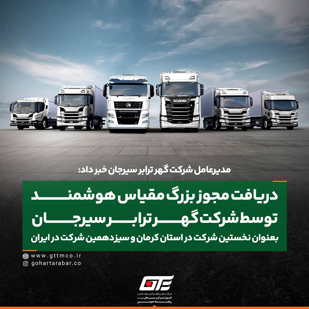 دریافت مجوز بزرگ مقیاس هوشمند توسط شرکت گهر ترابر سیرجان بعنوان نخستین شرکت حمل و نقل در استان کرمان و سیزدهمین شرکت در ایران