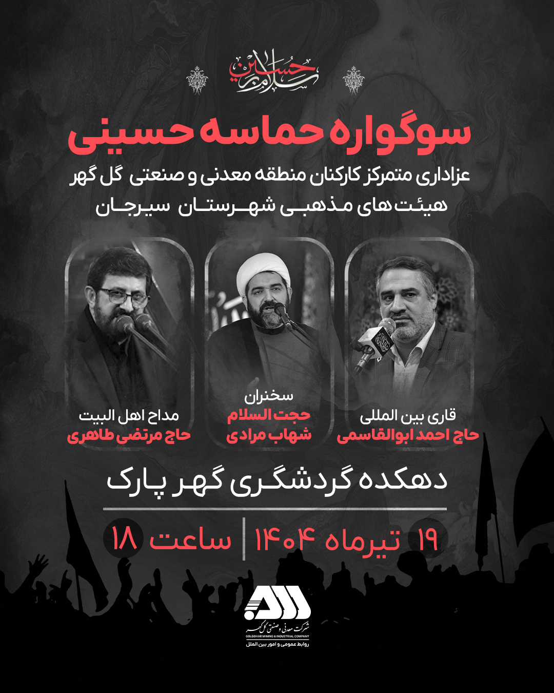 عزاداری متمرکز کارکنان منطقه معدنی و صنعتی گل‌گهر و هیئت های مذهبی شهرستان سیرجان 📌 دهکده گردشگری گهرپارک ۱۹ تیرماه ۱۴۰۴ _ ساعت: ۱۸