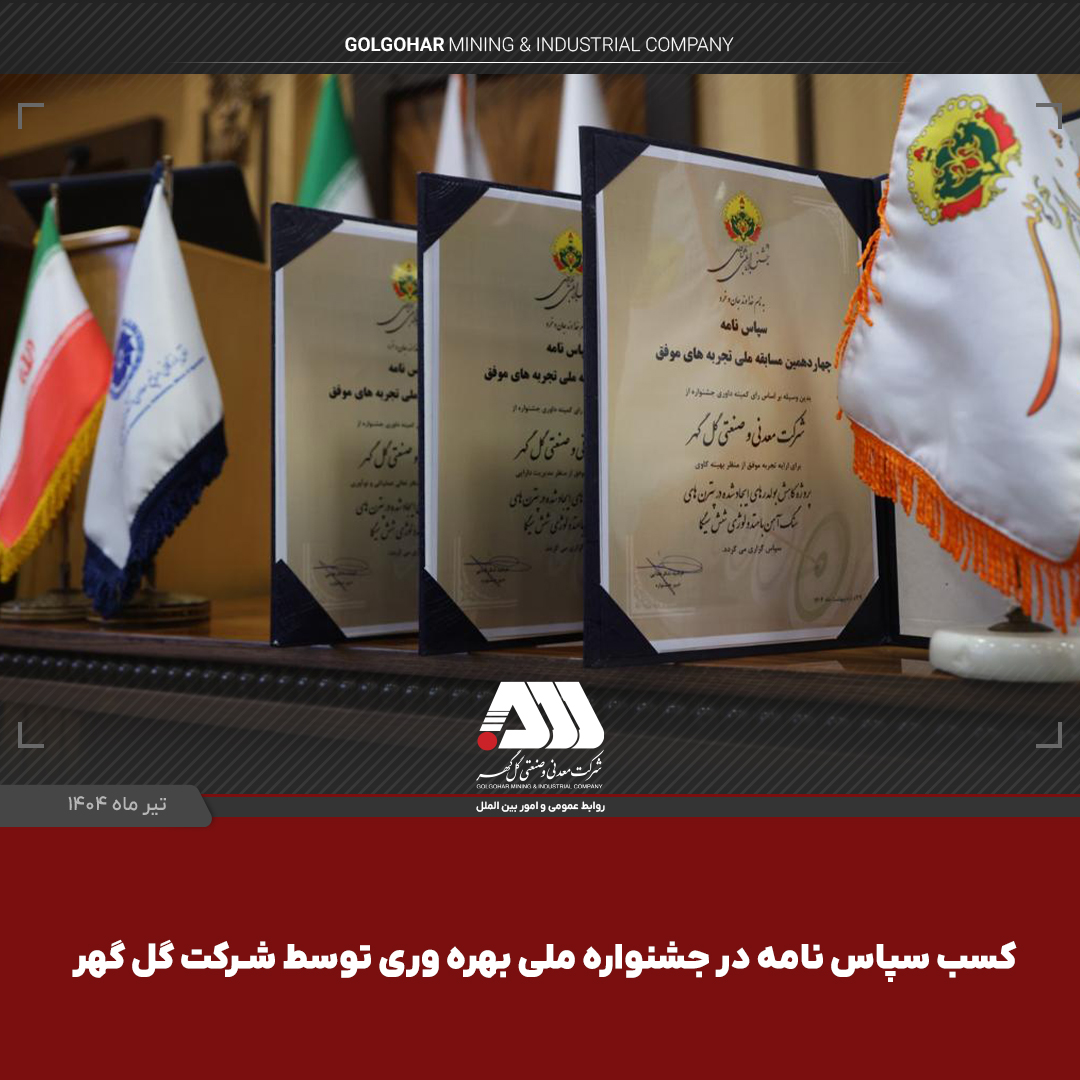 🔹 شرکت معدنی و صنعتی گل گهر در چهاردهمین جشنواره ملی بهرهوری موفق شد ۳ سپاس نامه در حوزه های بهینهکاوی، تعالی عملیاتی و نوآوری و همچنین مدیریت دارایی را دریافت کند.